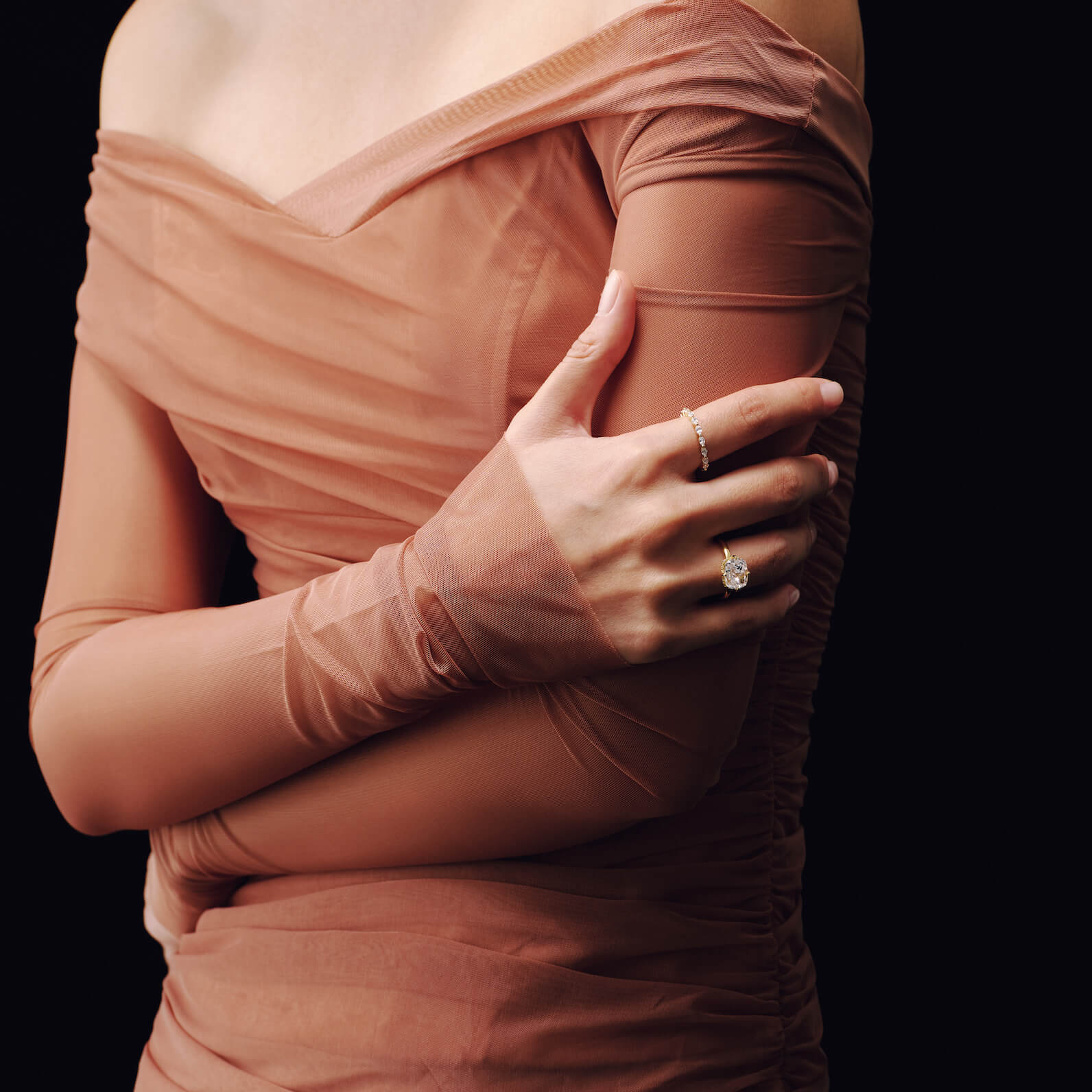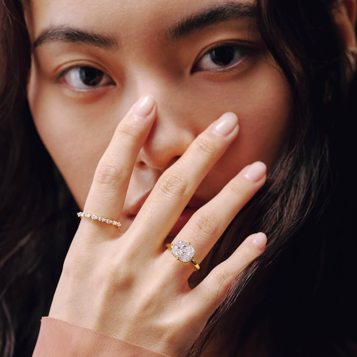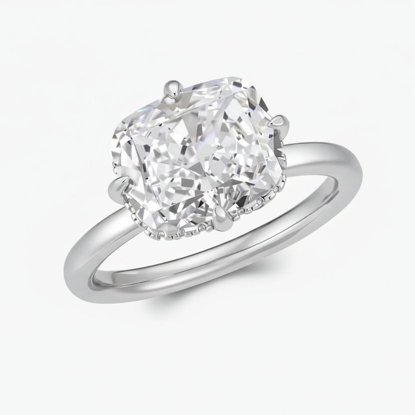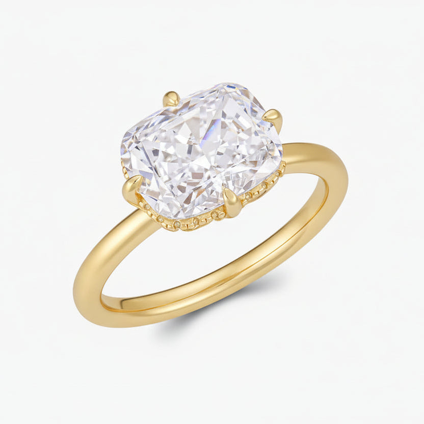 Elegant in its simplicity, the Fiona Ring features a single, cushion-cut stone set delicately to the side on a slender band. A timeless silhouette, understated, refined, and quietly bold.