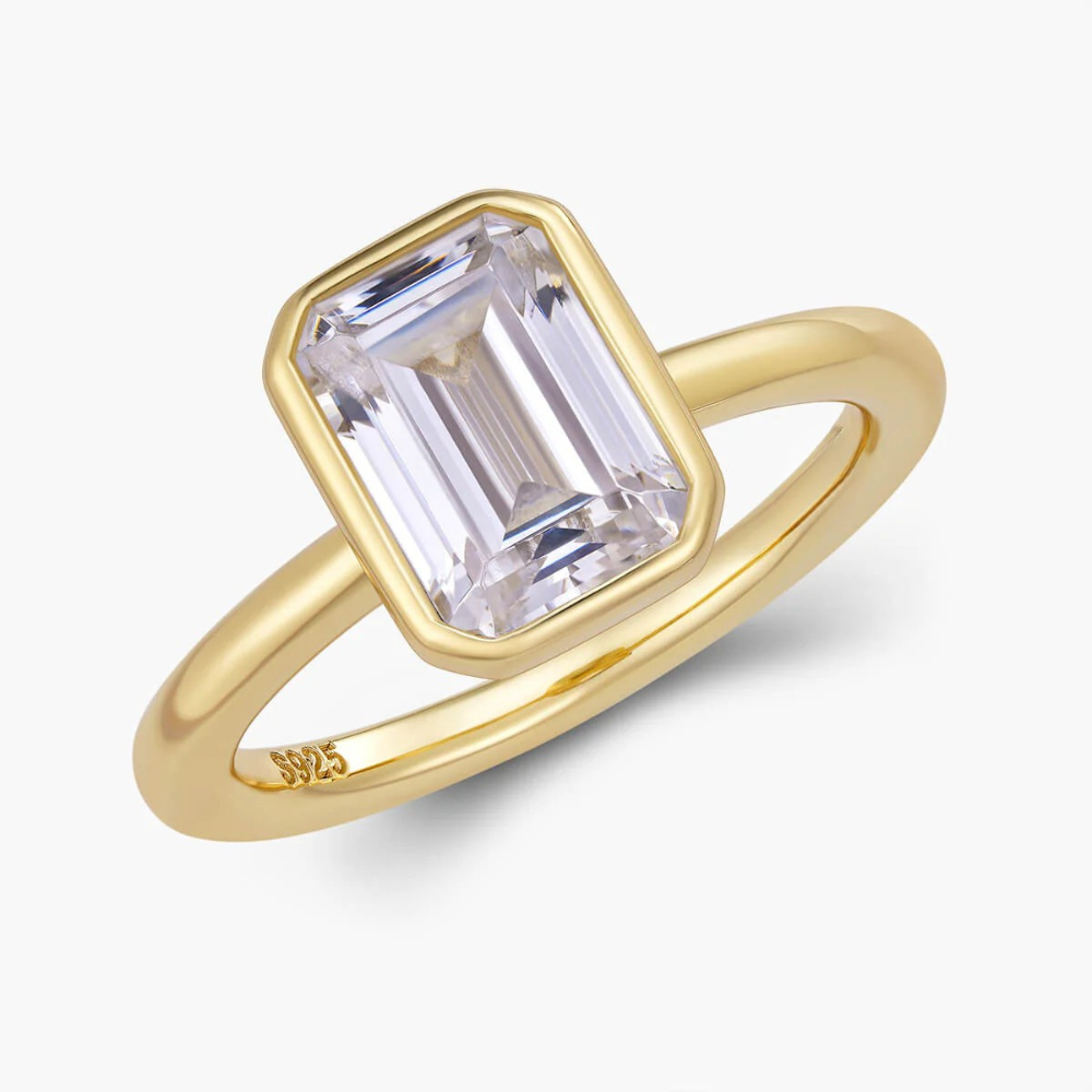 Meet the Giselle Ring: an elegant emerald-cut gemstone set in a sleek bezel setting for a polished, modern look. The clean lines of the bezel highlight the stone's striking shape and brilliance, creating a timeless piece that stands out. Perfect for stacking or wearing solo, the Giselle Ring adds a touch of refined sophistication to any collection.