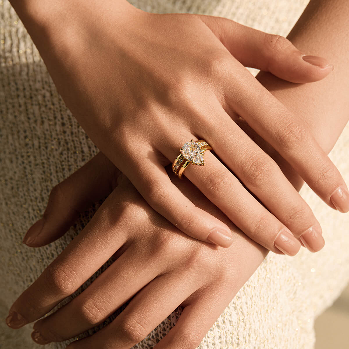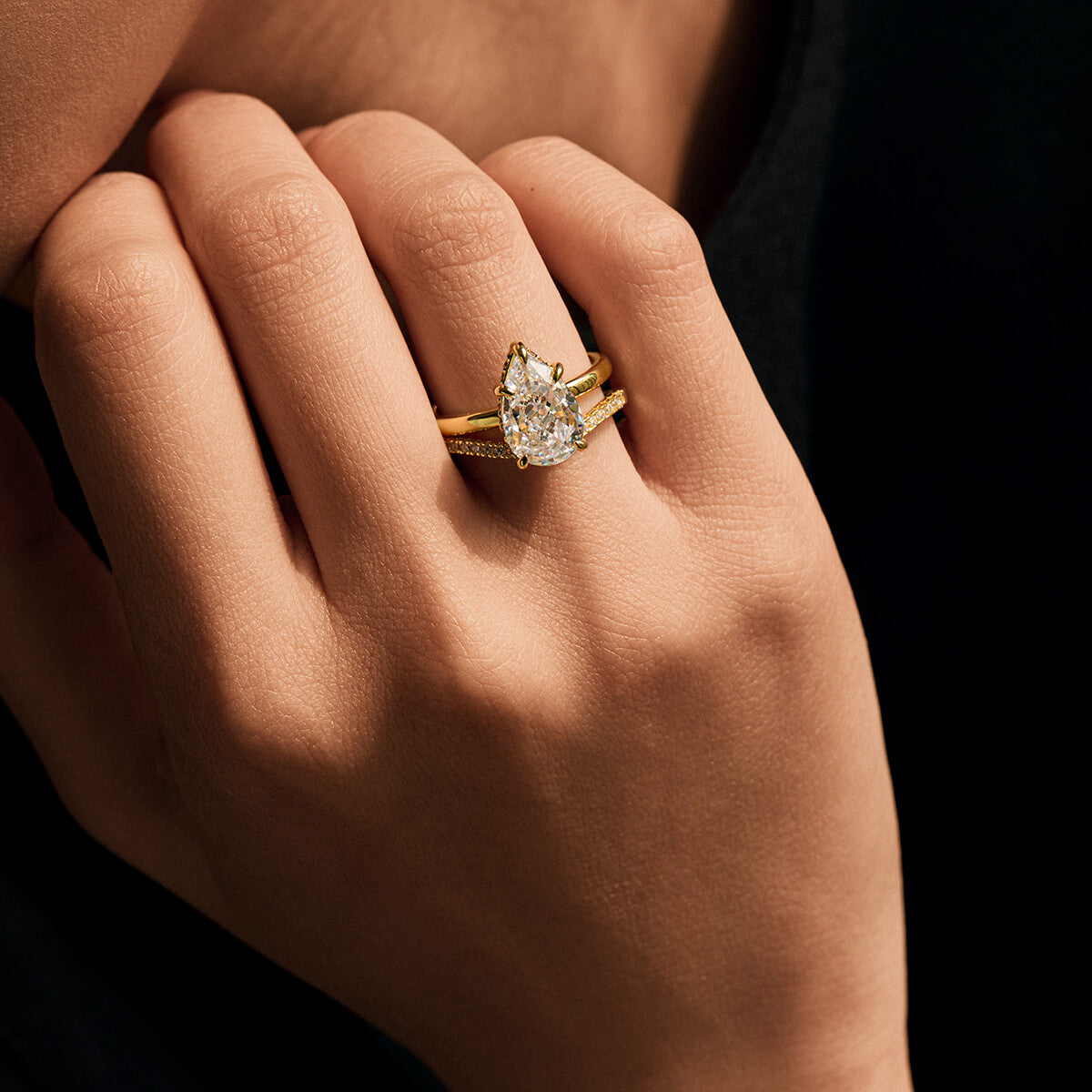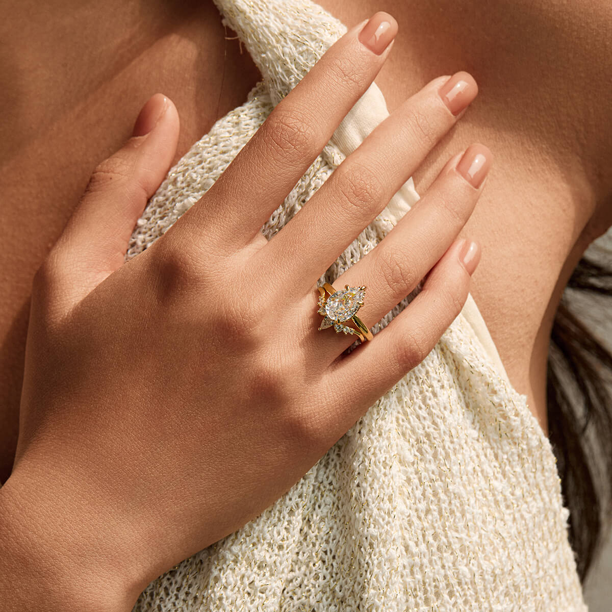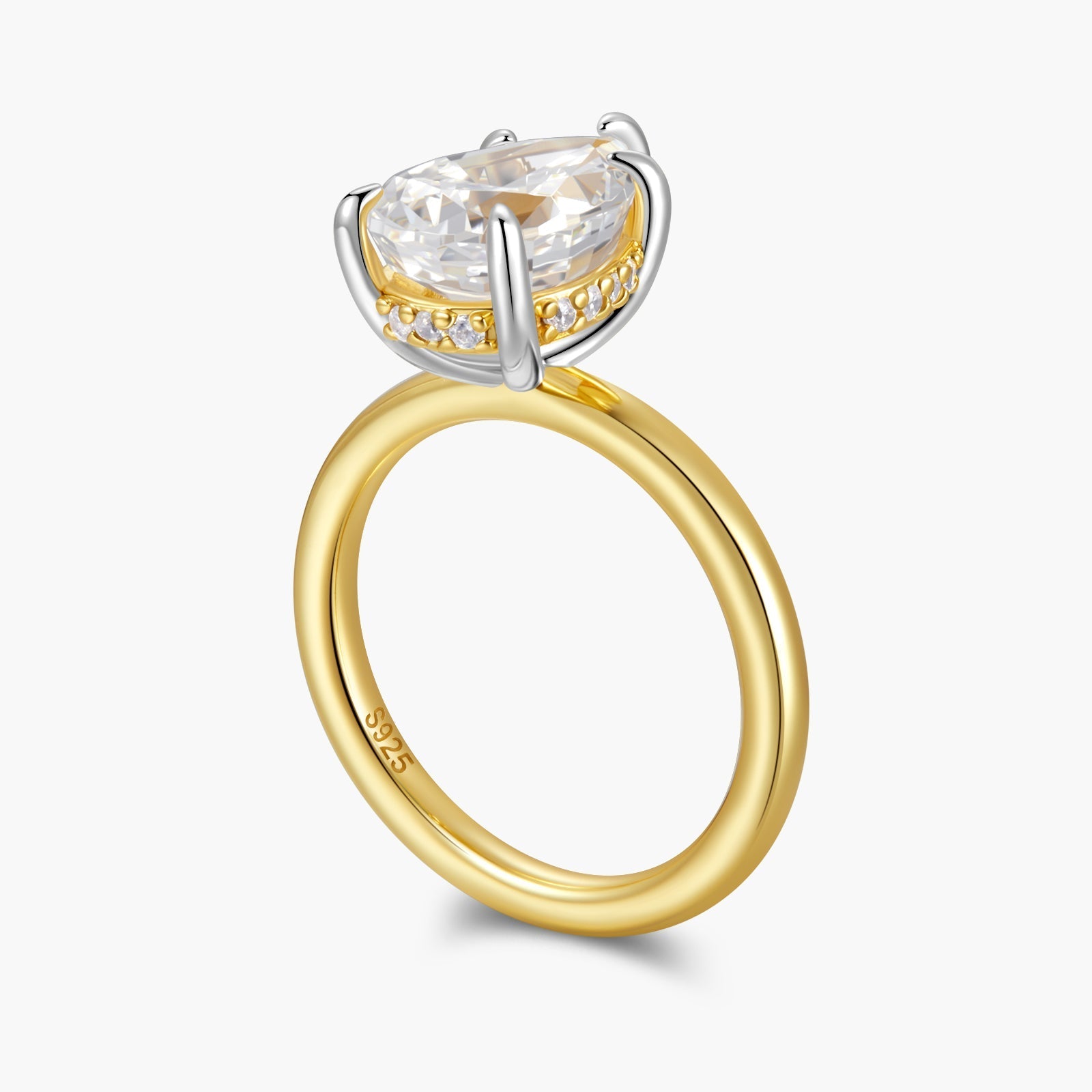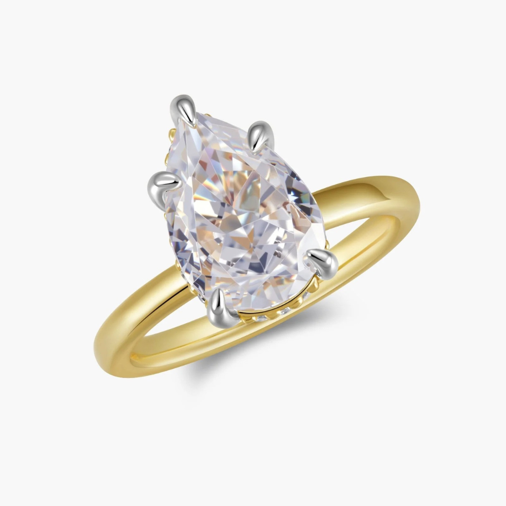 The Lotus Ring features a pear-cut centre stone secured in silver prongs on a gold band, creating a defined two-tone construction. Precisely set and structurally balanced, the design combines classic stone shape with considered technical detail.