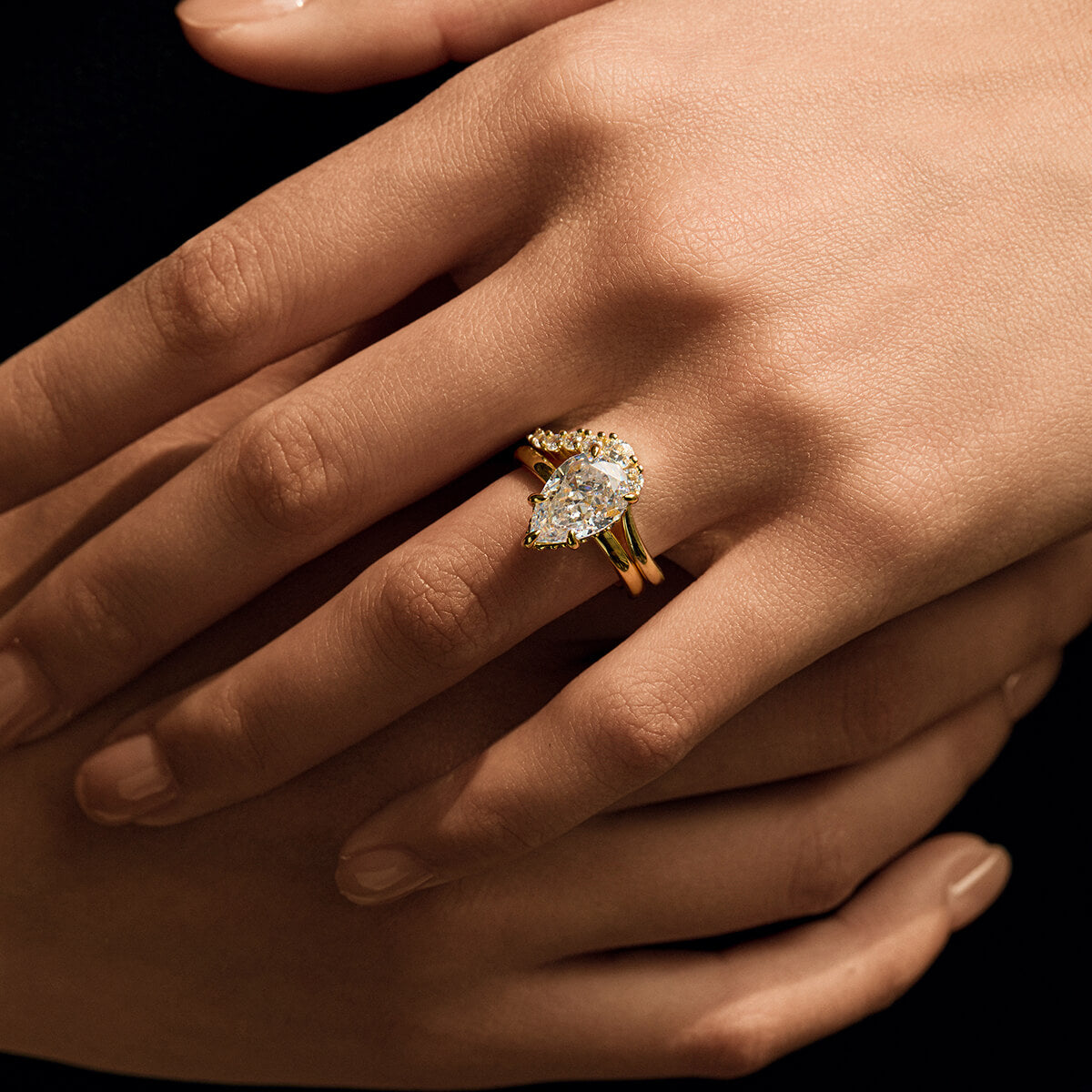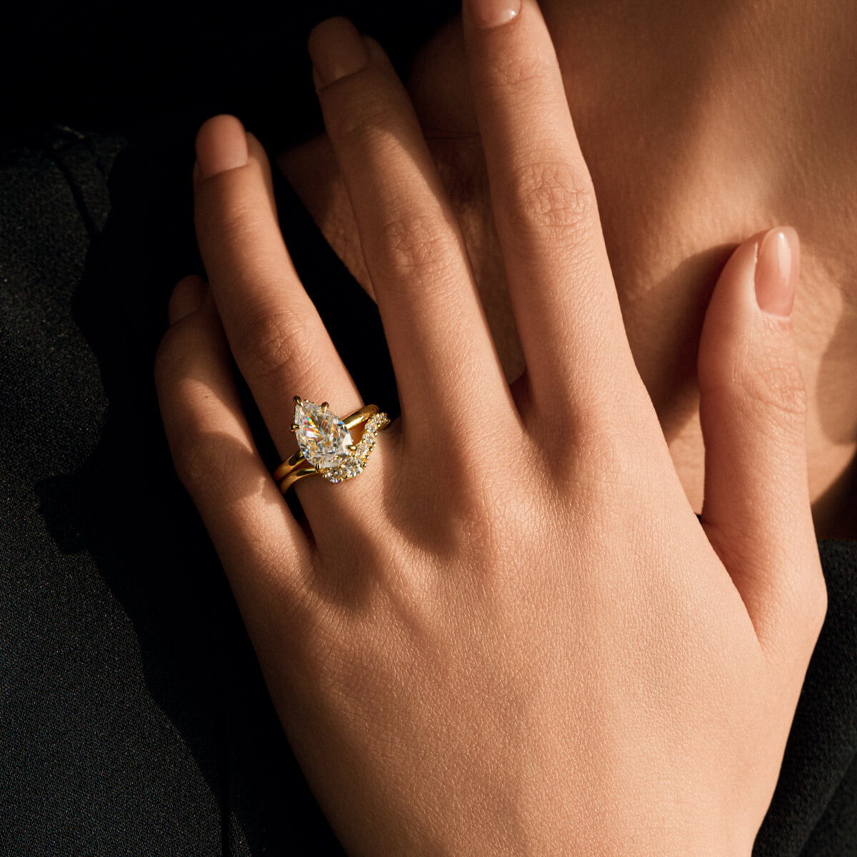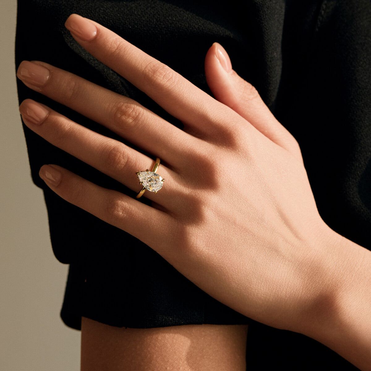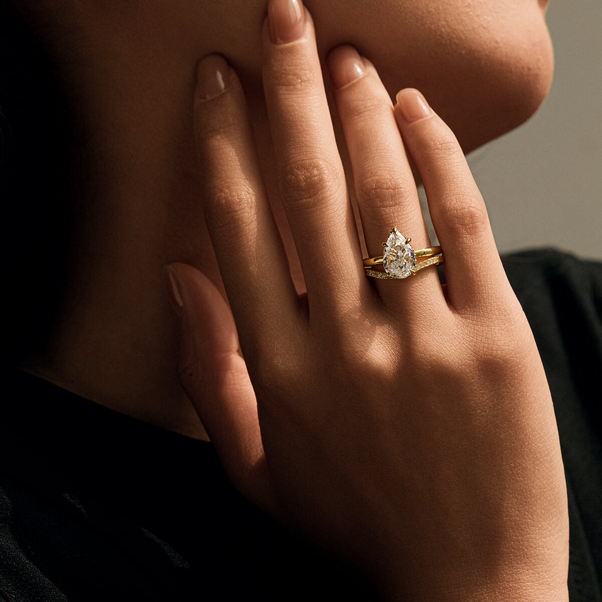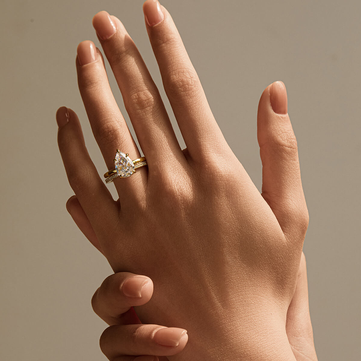 The Lotus Ring features a pear-cut centre stone secured in silver prongs on a gold band, creating a defined two-tone construction. Precisely set and structurally balanced, the design combines classic stone shape with considered technical detail.
