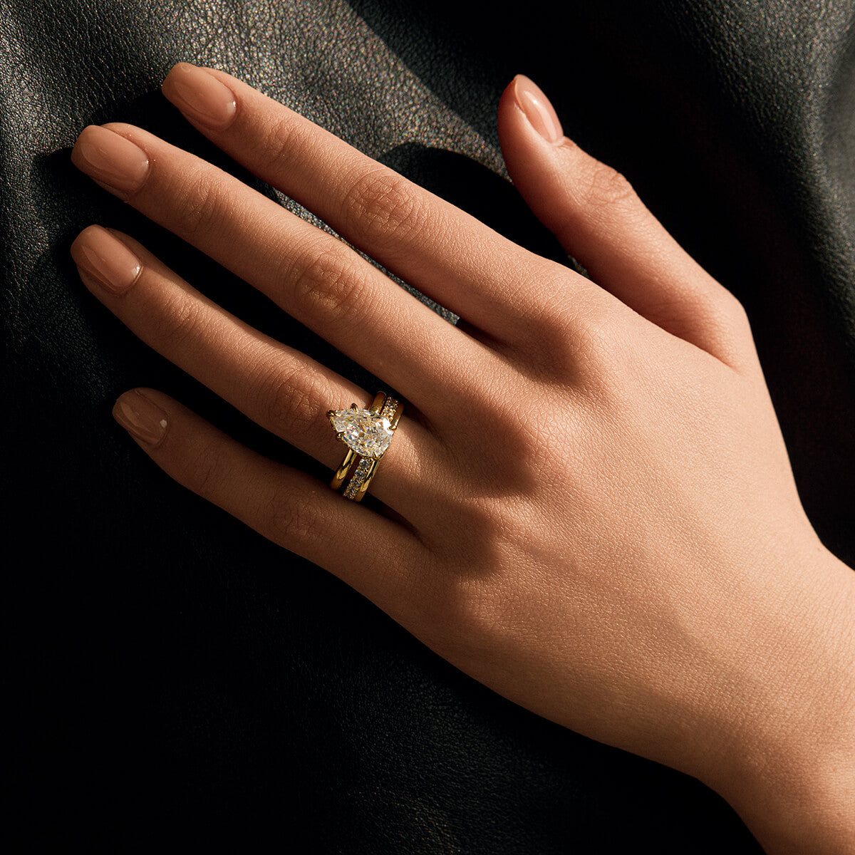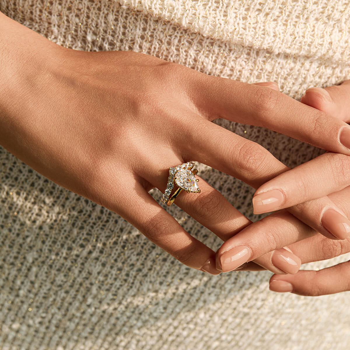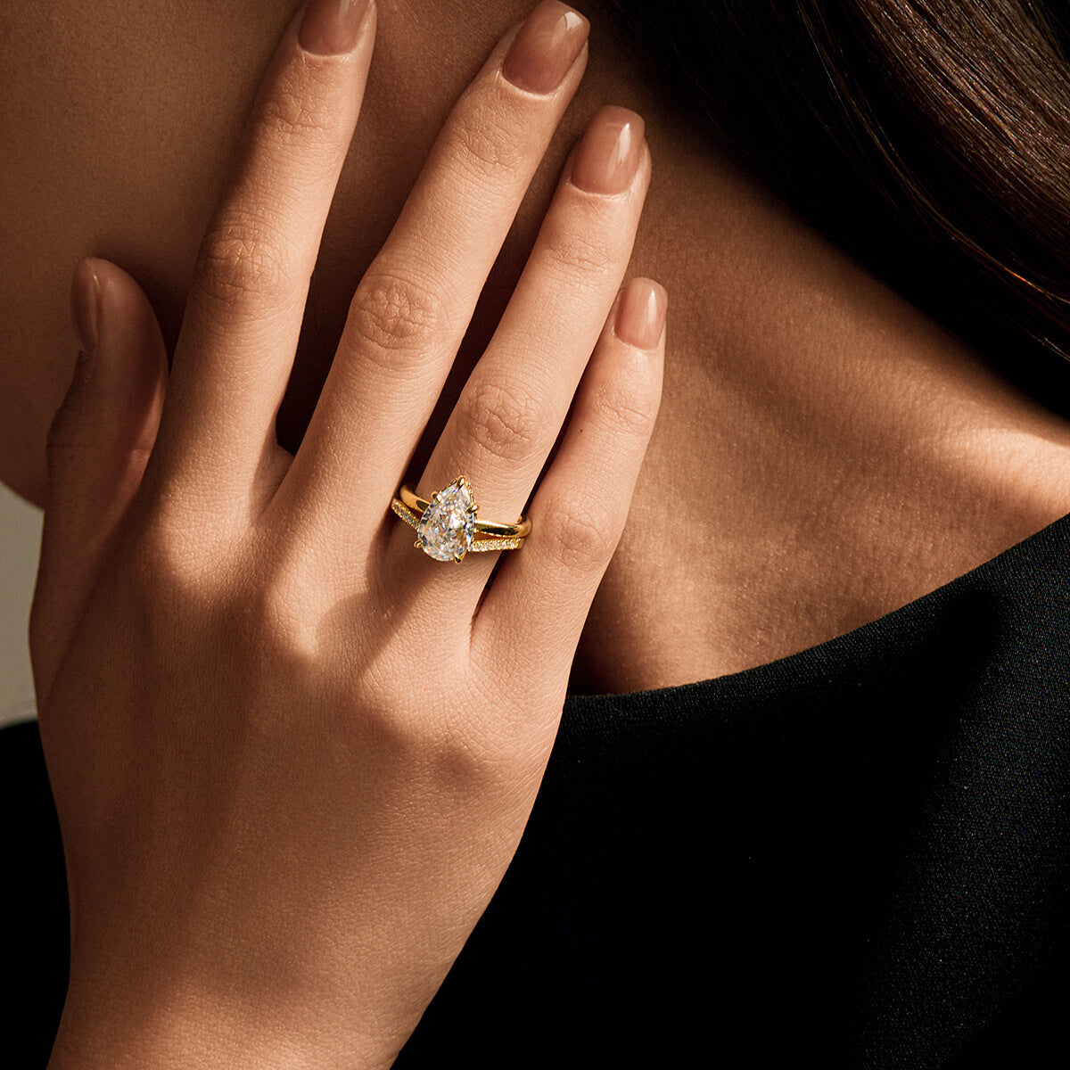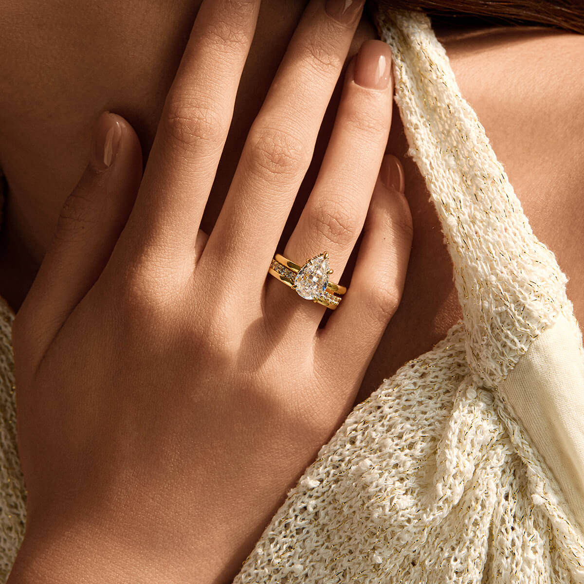 The Lotus Ring features a pear-cut centre stone secured in silver prongs on a gold band, creating a defined two-tone construction. Precisely set and structurally balanced, the design combines classic stone shape with considered technical detail.