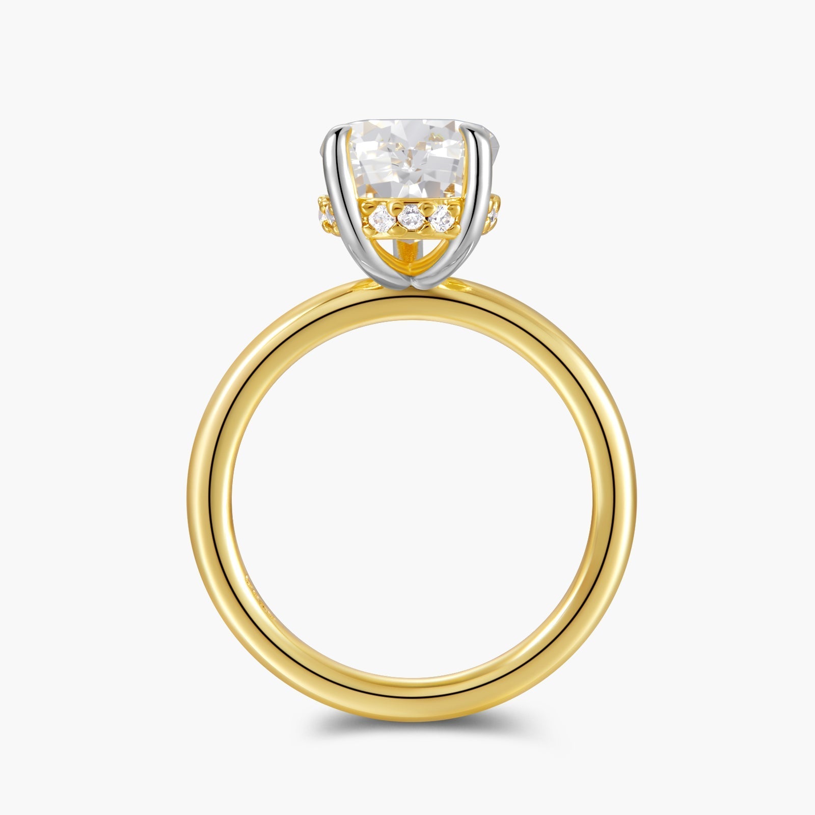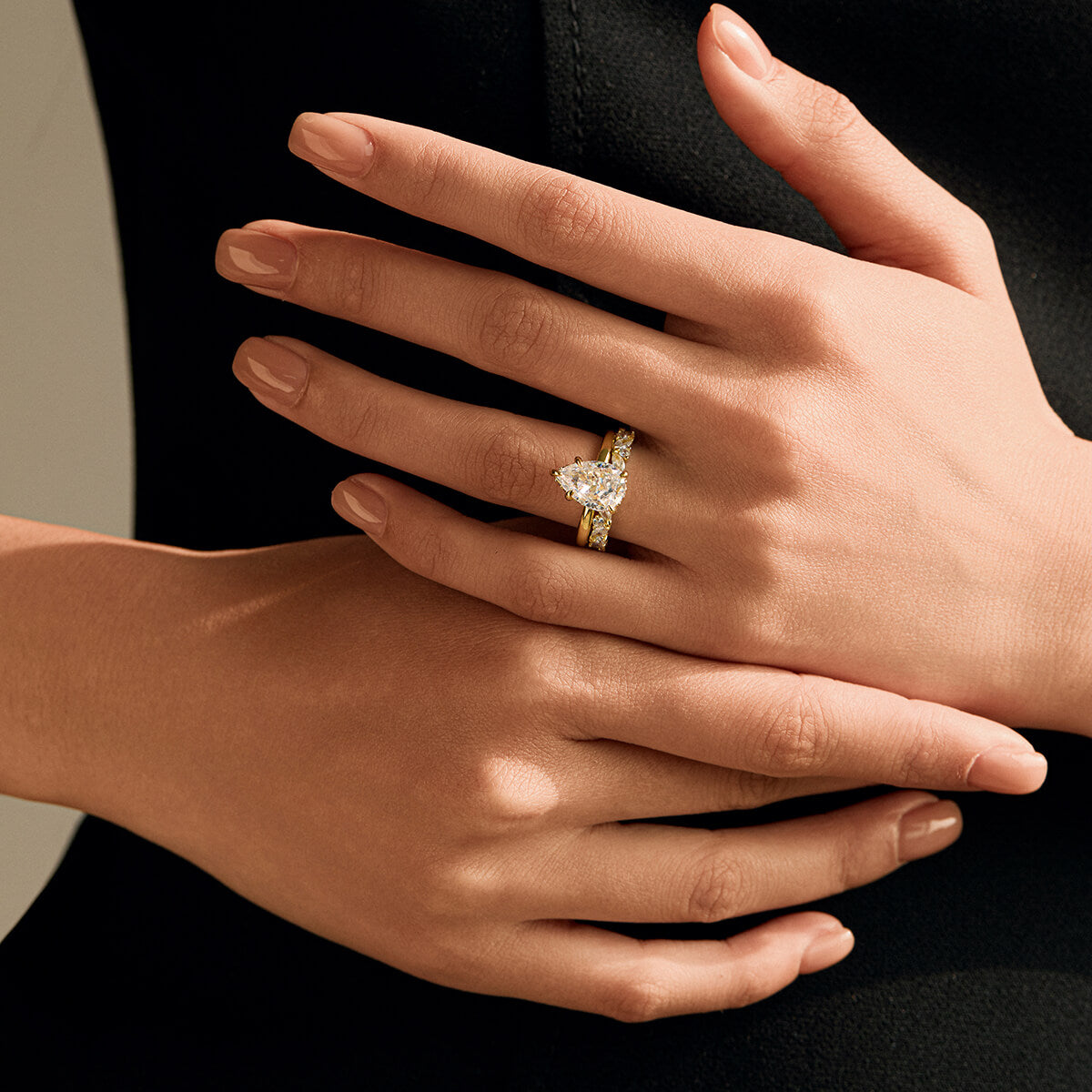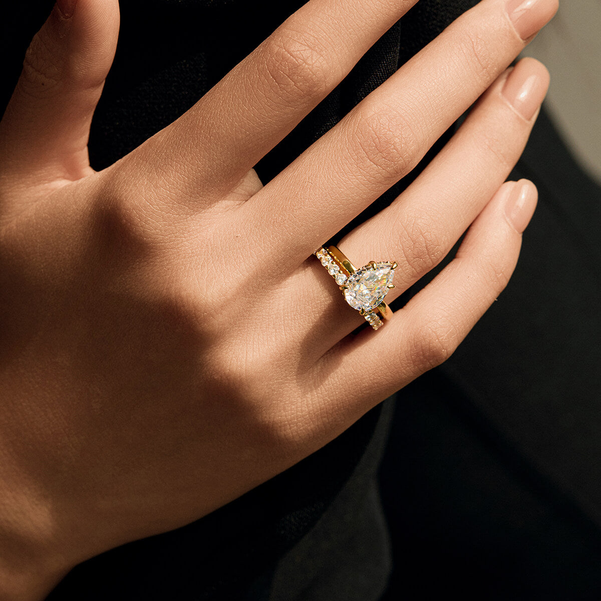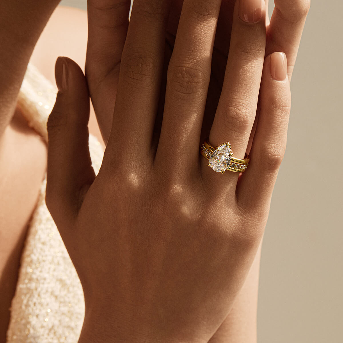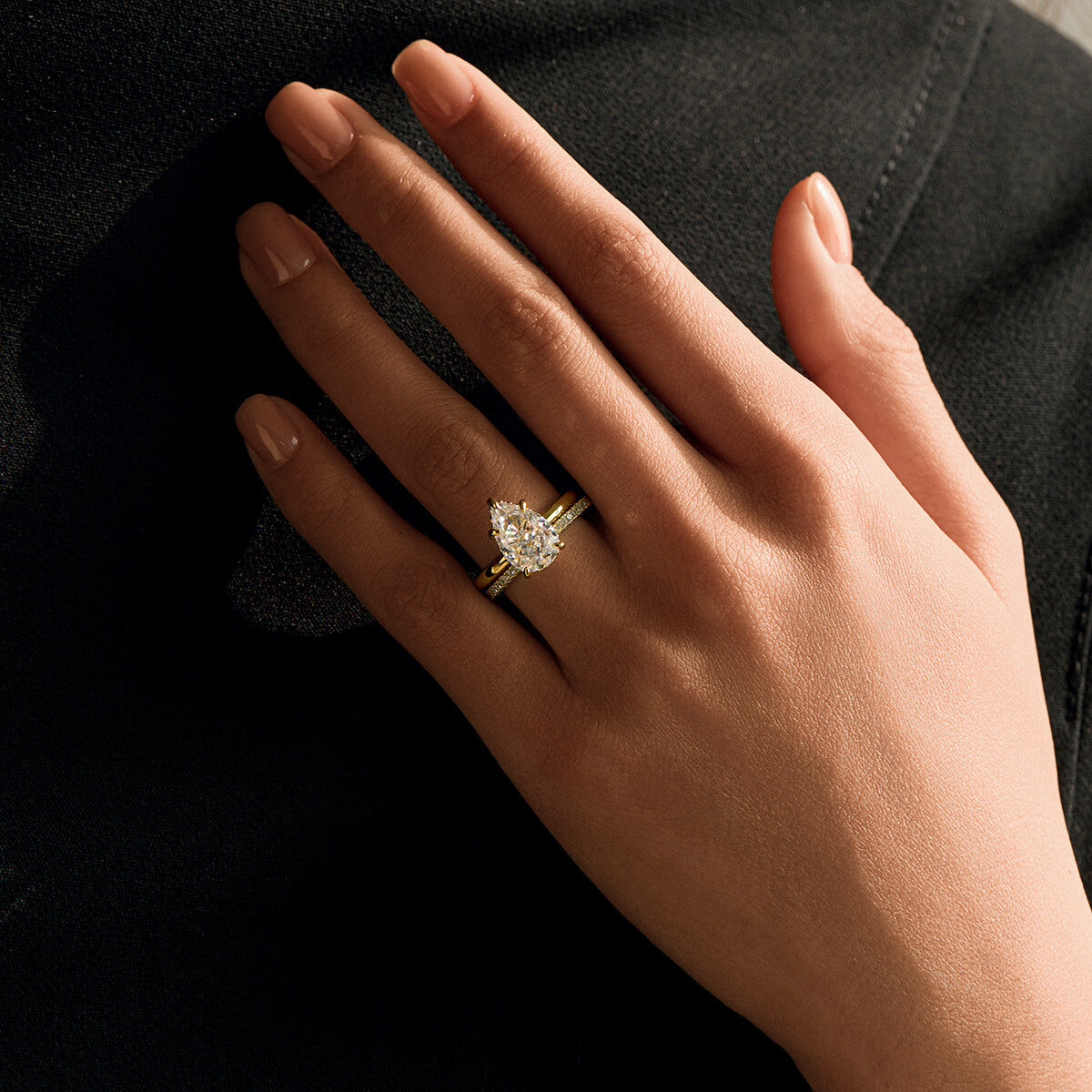 The Lotus Ring features a pear-cut centre stone secured in silver prongs on a gold band, creating a defined two-tone construction. Precisely set and structurally balanced, the design combines classic stone shape with considered technical detail.